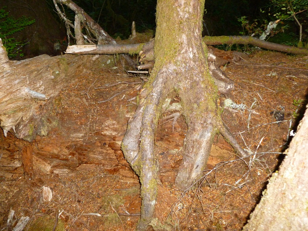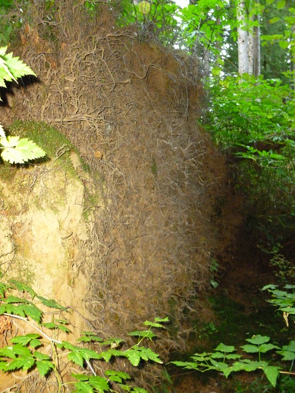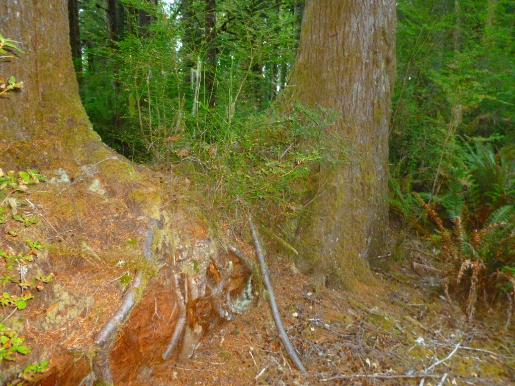 I was walking along and saw these roots. Holy Cow! They are wrapped around a fallen old growth tree – that is very decayed. how long ago would that tree have fallen to have these trees grow to this size? I wandered up and down the tree line and this is what I saw: