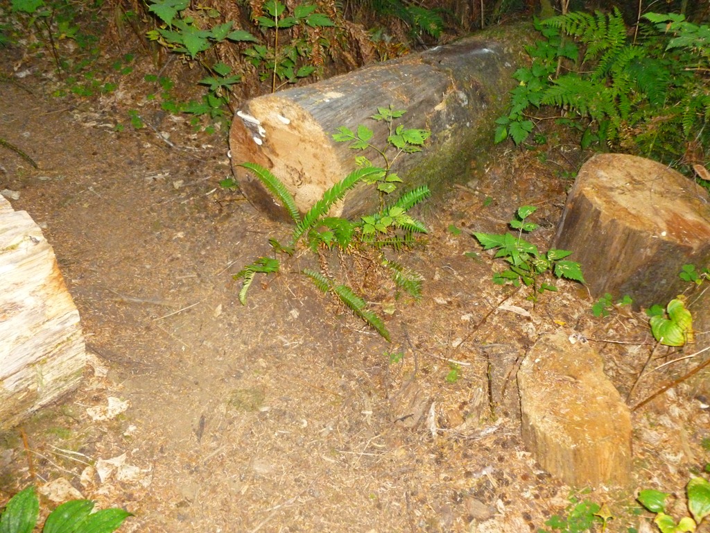 This free fall looks recent, evidenced by the fresh cut rounds.  Many times people will cut the tree to fit the trail.  The Tree Trimmers that work on the highway park their trucks nearby, I’m guessing this is their work on their way to their lunch spot.