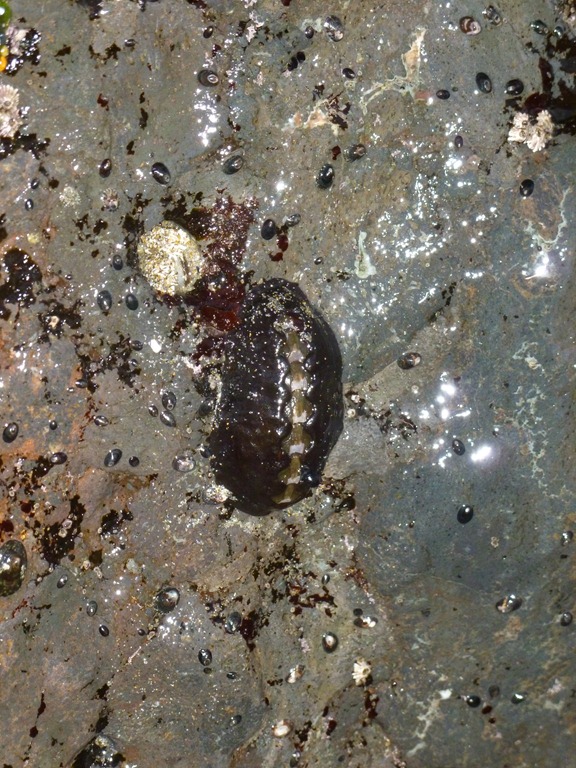 We were right that this was a Chiton. This particular fella is Leather Chiton, Katherina. The mantle covers all but the very center of the body. This so so that it can withstand the surf and sun. All Chitons have 8 shells down their body. They feed on Algea. When they are taken off of a rock they will curl up like a pill bug. They have a boot and are related to the Snail Family.
