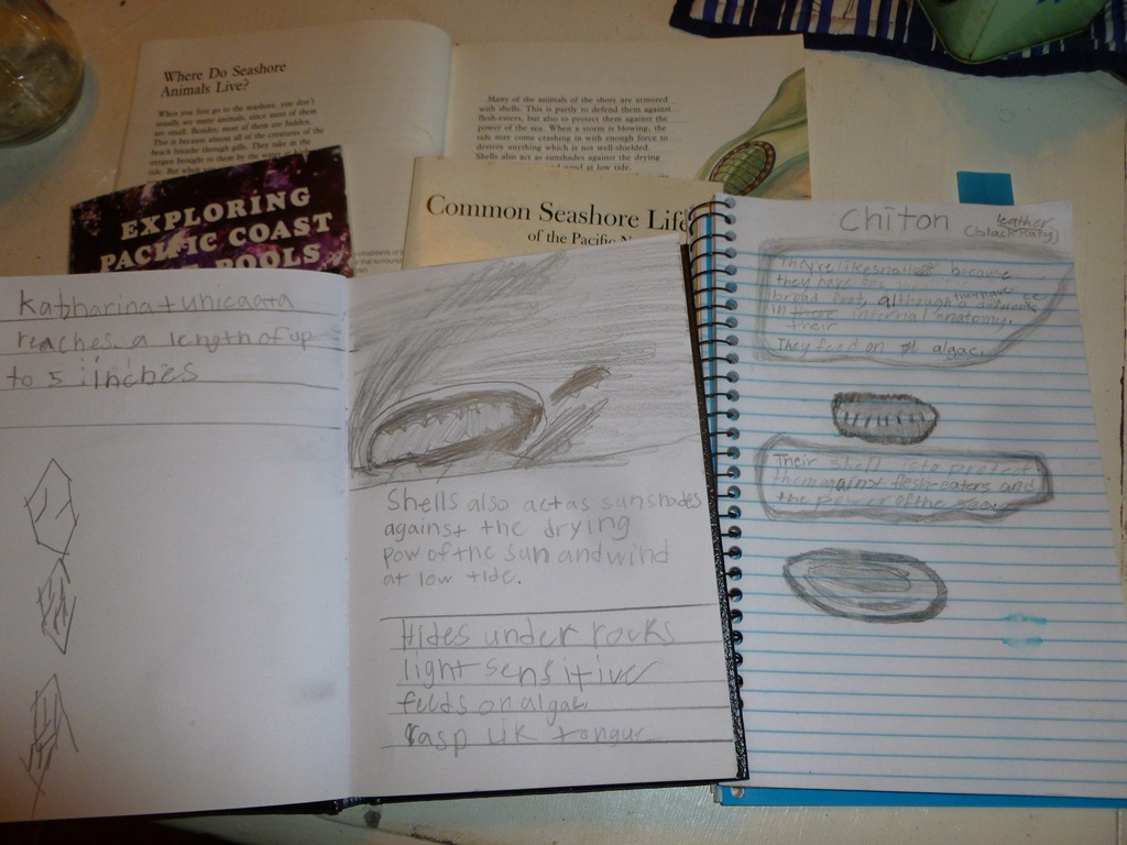 We looked up the object on line and browsed through four tide pool books. The assignment was to read through each entry and glean interesting facts. The goal question: If you are at the tide pools this month, standing next to a tourist, and they ask you the name of this creature, what will you answer? What sorts of information would you like to share with that individual? Write out your facts, draw the object, commit it’s name to memory.