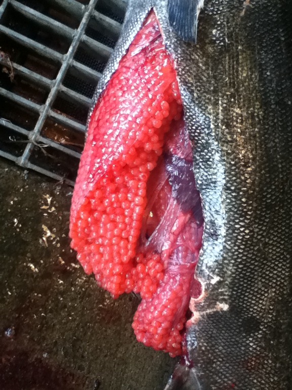 The females were laid out on a table that looked like a pallet with grooves that fit 5-6 fish in to rest. A quick cut by the tail helps the fish bleed out so that there is less blood when the eggs are harvested. Once the fins are rested and fish is ready – they have a hook type knife to slide up the fish. You instantly see how ready to spawn the fish is by how the eggs drop out, dark red, separated, quick flow. The photo below is of the only fish of the day that was harvested a bit early. There was sorrow on the entire deck from all of the workers for this poor hen. Her eggs were very tight together, lighter color, not ready for fertilization.