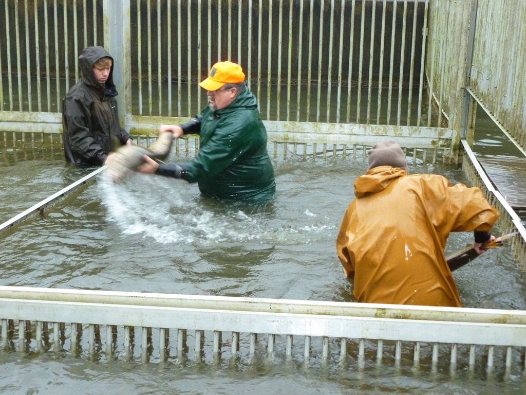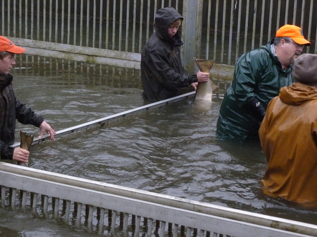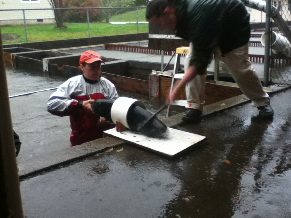 Four Fish and Wildlife Workers and two volunteer teen boys stand waist deep in the center section of the Salmon tanks. A quick cold gloveless hand reaches down to grab the salmon just above the tail. The other hand smoothly reaches under the fish head for a quick inspection – Boy or Girl? Ready to Spawn or Wait a while? Classification at it’s wettest for sure. Tossing the fish in 5 different areas to keep them separated.