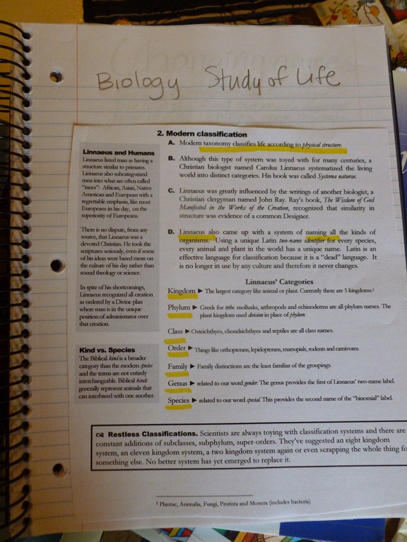 The Video. As soon as we started watching Introduction: Defining Life and Life Classifications – I knew I had the missing piece of our puzzle. Our family enjoyed the teacher, his voice and his mannerisms. I enjoyed that he would walk through a library looking at the living books we use at home, pull one out, and help us define a precept. He would then walk through the area outside where the subject was found and show through words and actions what he was talking about using several examples.