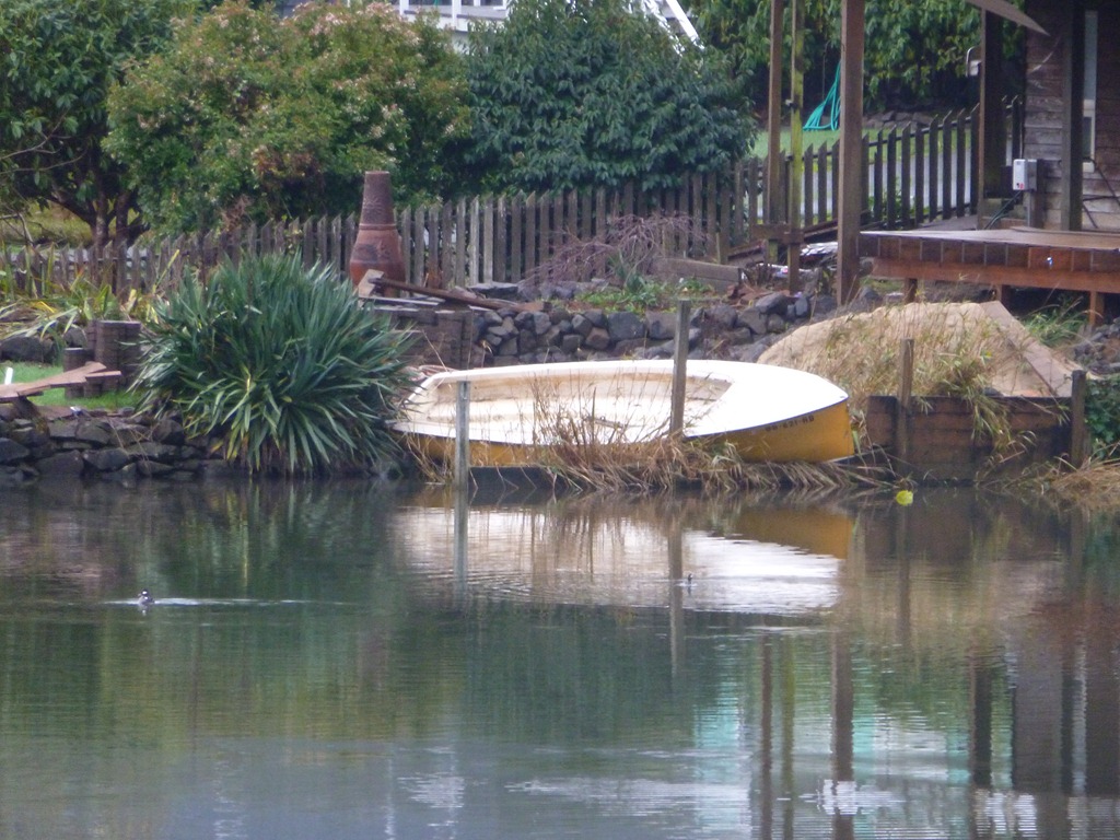 This home is getting a new septic tank and new deck wraps around the house. This little boat gets tossed around in the storms. One more push and it would be in the water this time! Well, it is in the water, but not all the way.