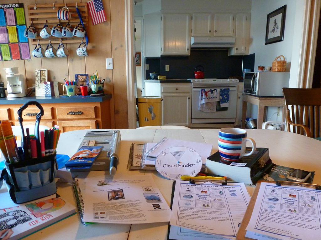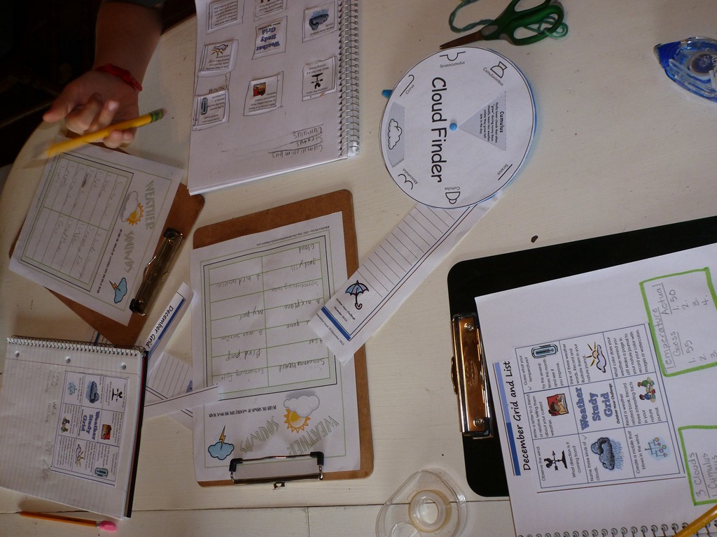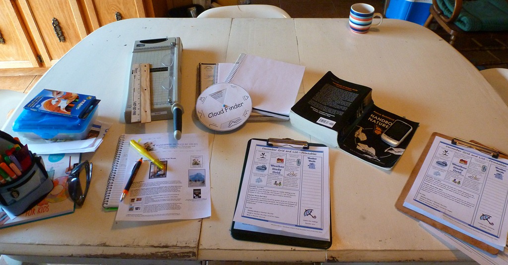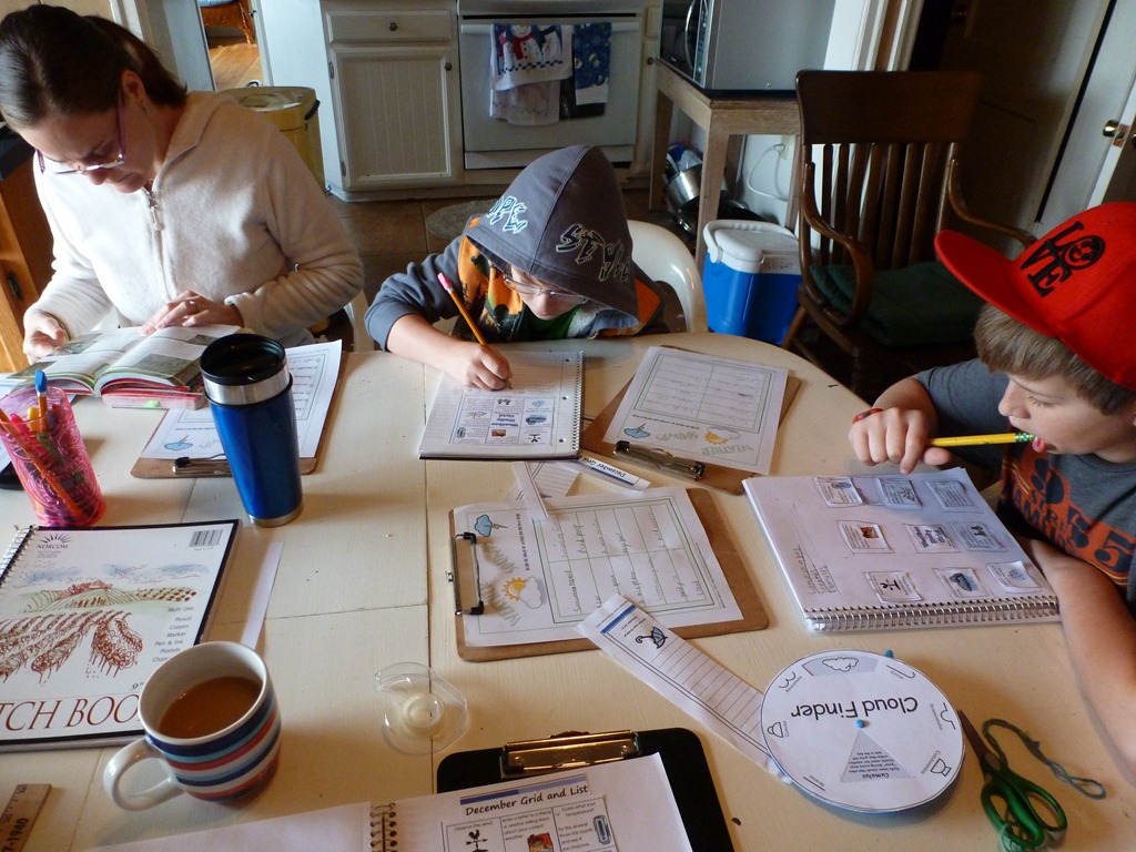 On Friday Morning – I get an email letting me know what the challenge will be. This week? The Weather Grid and Weather Sounds. We have family coming along side us this month, learning how we learn with Charlotte Mason style. I printed several copies of the notebooking pages and got out enough clipboards for everyone to take the walk.