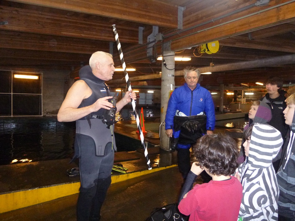 The kids asked what would happen if the diver felt as if he were in danger. He again restated that there really isn’t much of a threat. The sharks are well fed. Well cared for. Their needs are looked after. They have a pattern. However, should they get uncomfortable in the tank, something unexpected, they would go forward. Towards the shark. He took the Shark Stick and spun it in a circle like a baton while stepping forwards towards the children. They all took a step back.  He said – it is good that they know the boundary is still there. That we know where the shark is and what it is doing, and that we show him – with the stick – when he should back off.
