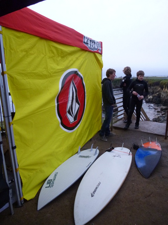 Saturday morning, the boys had the van re-loaded and breakfast made by 5:40 in the morning. We were told to be out at 6 a.m. or risk not getting a spot on the line up. At 7 a.m. Volcom started asking for registration forms and it was frenzy of soccer surf mom’s shoving papers at them. Our Team all got a slot. Jon was in the first heat of the day with the Groms, ages 11-13. He was pretty nervous.