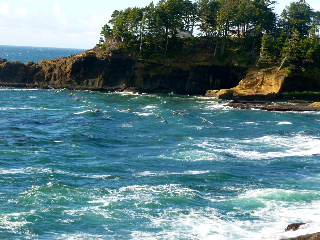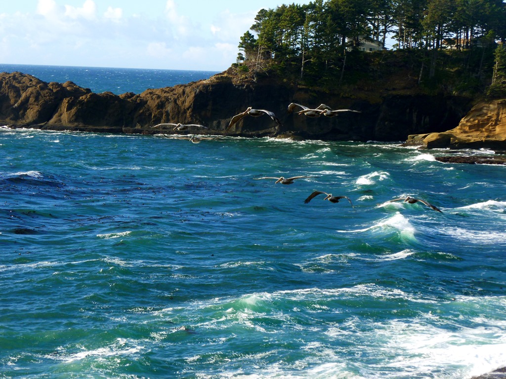 We know that the “Brown Pelican” lives here in Lincoln City. They too love to fly offshore with the waves. They seem to be darker. This one had a white neck and face and a bit lighter body.