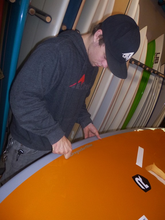 First Step – Tyler puts some Oregon Surf Shop love on the top and bottom.