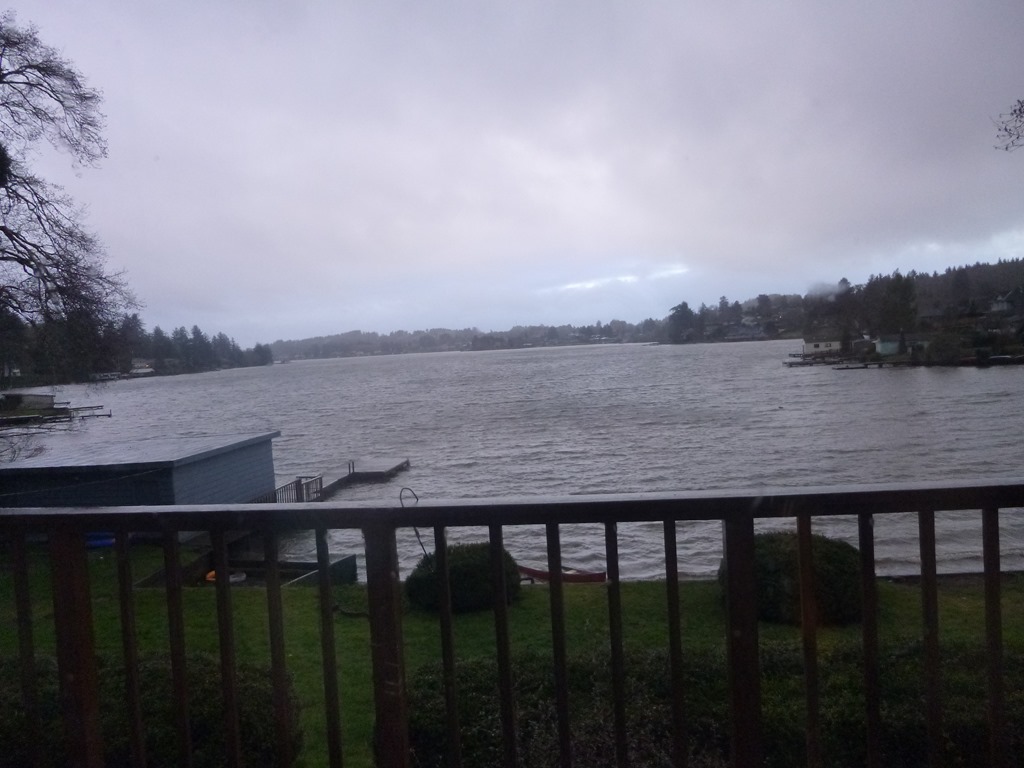This morning at 7:30 – I braved opening the blinds to peek and – JOY – There it was. Full of water, but on the shore. Not sure how that happened. I put on a rain coat and some knee boots, grabbed my stock pot, and went out for a rescue.