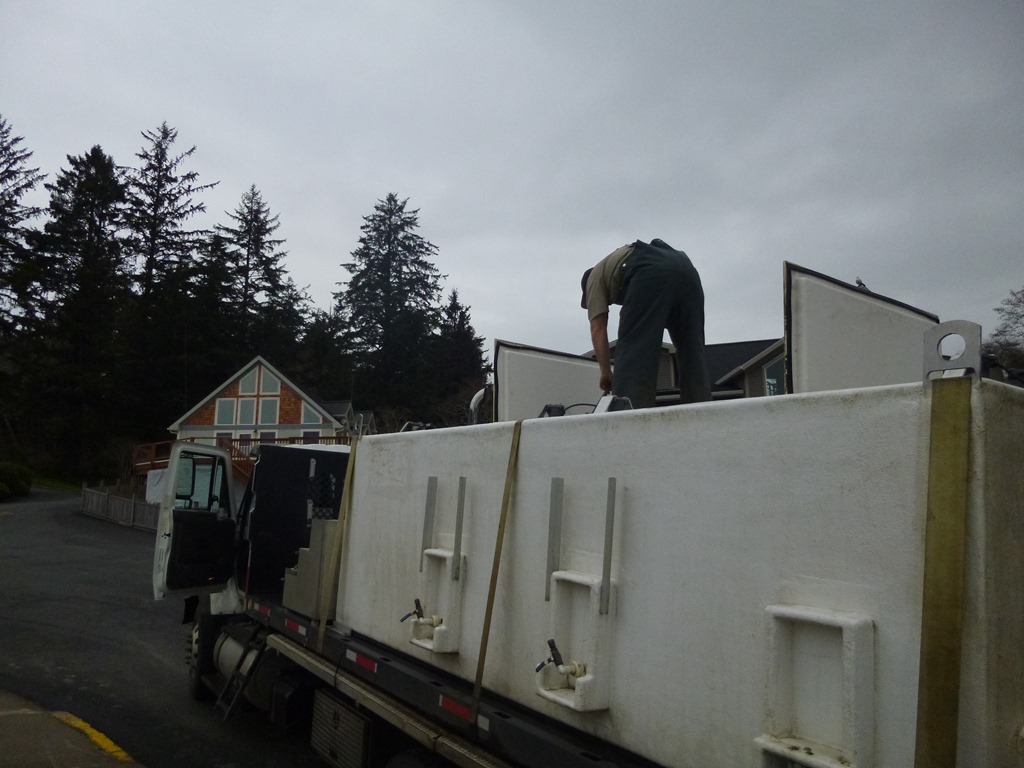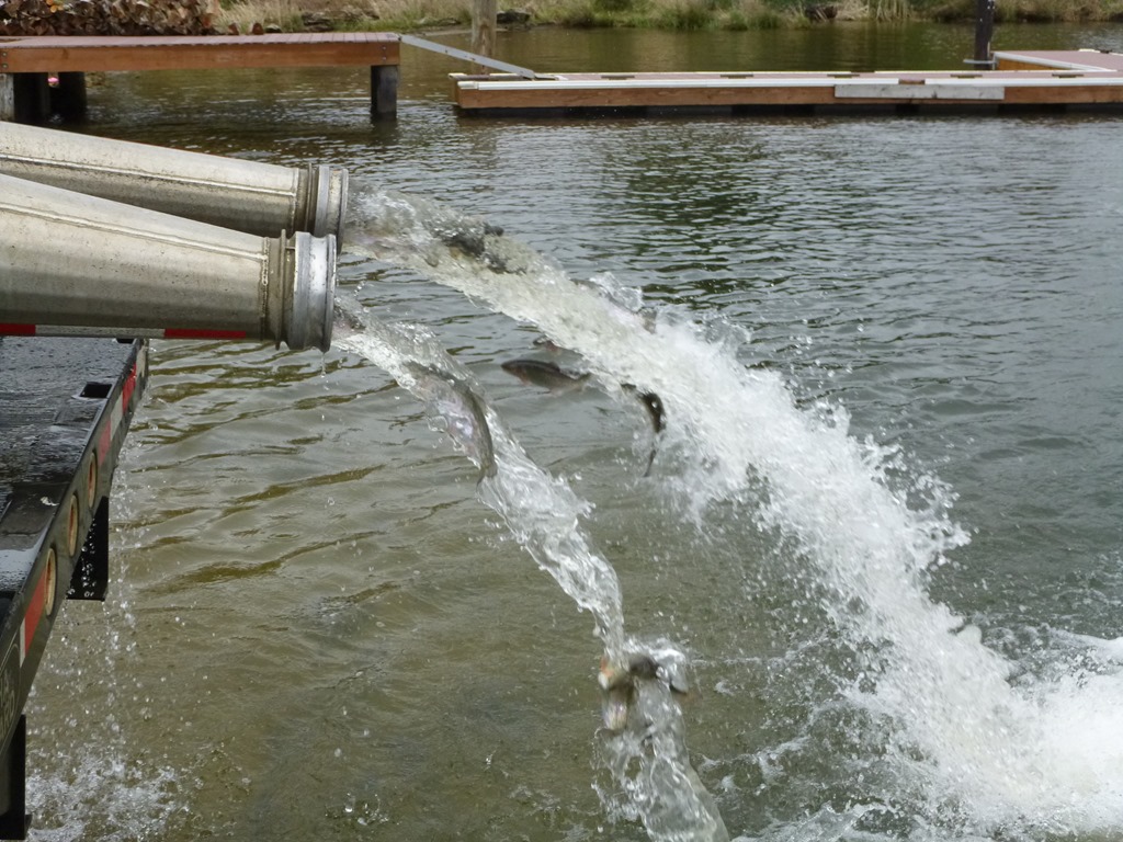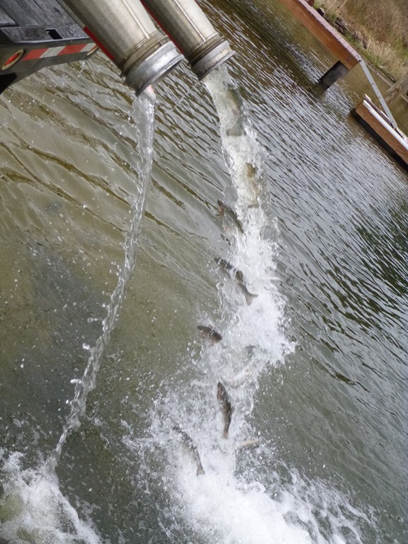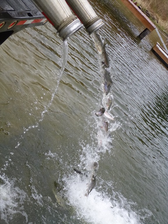 Thanks to a friend’s post on Facebook – we learned that the trucks were scheduled for 10:30 on Wednesday. Knowing that we’ve missed the truck before, we showed up at 10. And waited. And Waited. And called the fish hatchery at 11, and found out the truck was on it’s way – after they had a lunch. At just before noon – the truck arrived! Pulled up to the lake, took off the caps – and let er rip!