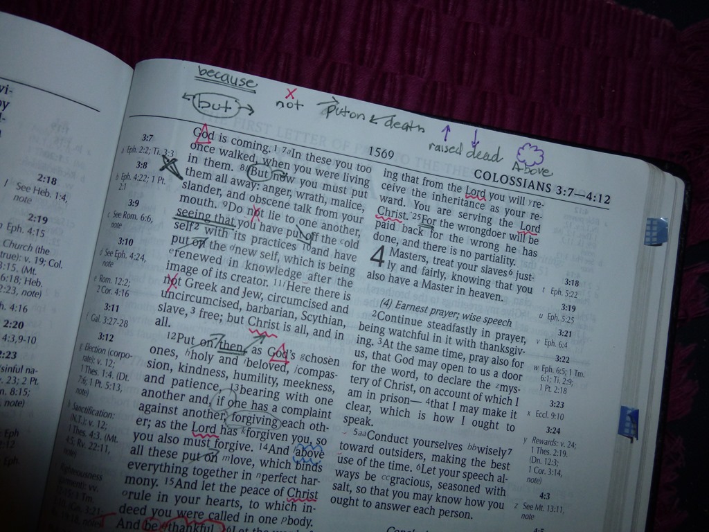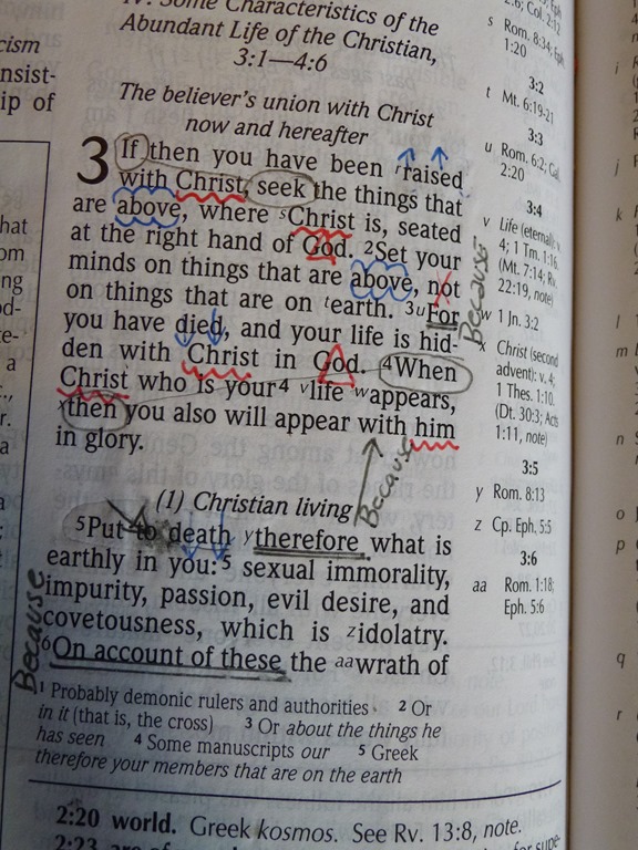 I use Red for Christ/God/Spirit. After marking these words, I like to scan the text and make lists. What do I now know about Christ from this passage? That I have been raised up with Christ. That I need to seek Things Above. That Christ is Above. That He is seated at the Right hand of God. That I am hidden in Christ. That I am In God. That He will Appear. That He is my life. That I will appear with Him.