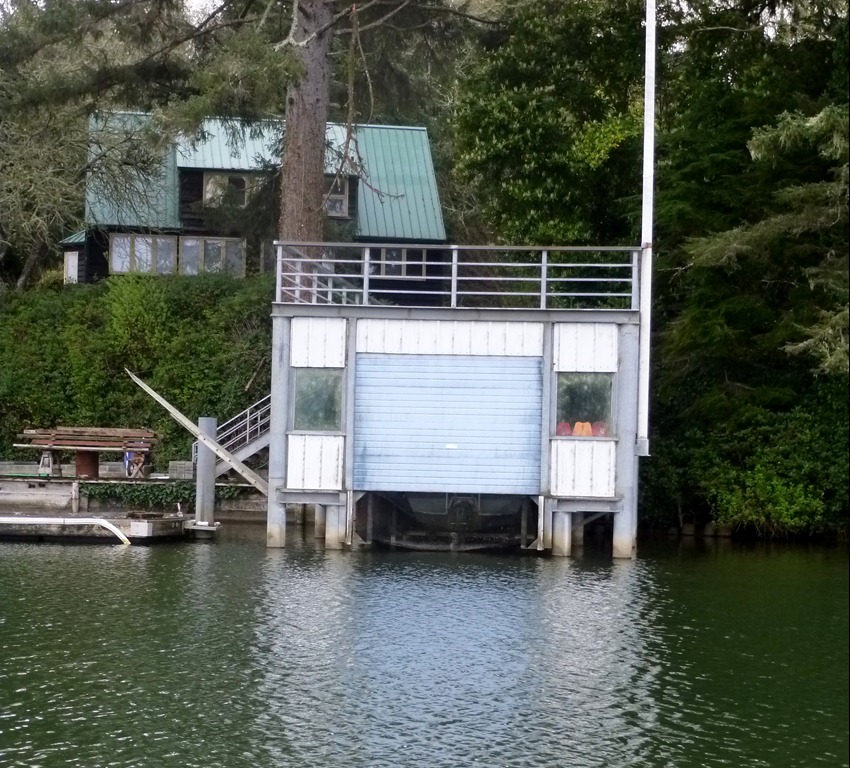 Love this boat house. In the summer it is all lit up, party on top and on the docks. Love the wake boards peeking out the window this winter.