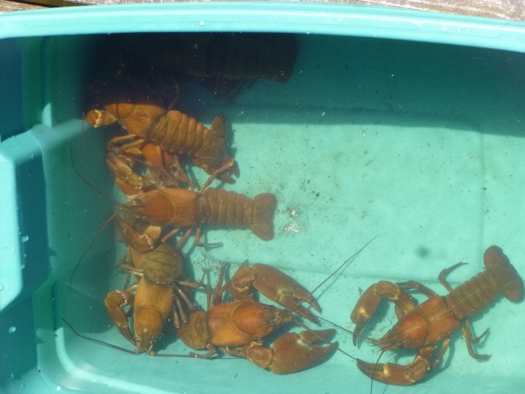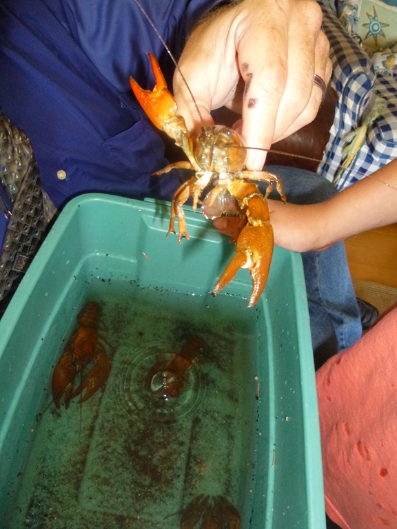 Dad was home for lunch and got in on the action. He caught quite few quickly. We are low on our seasonings right now, not enough for a decent boil, so we’ll wait . . . Jon ate one after we tossed them all back into the lake.