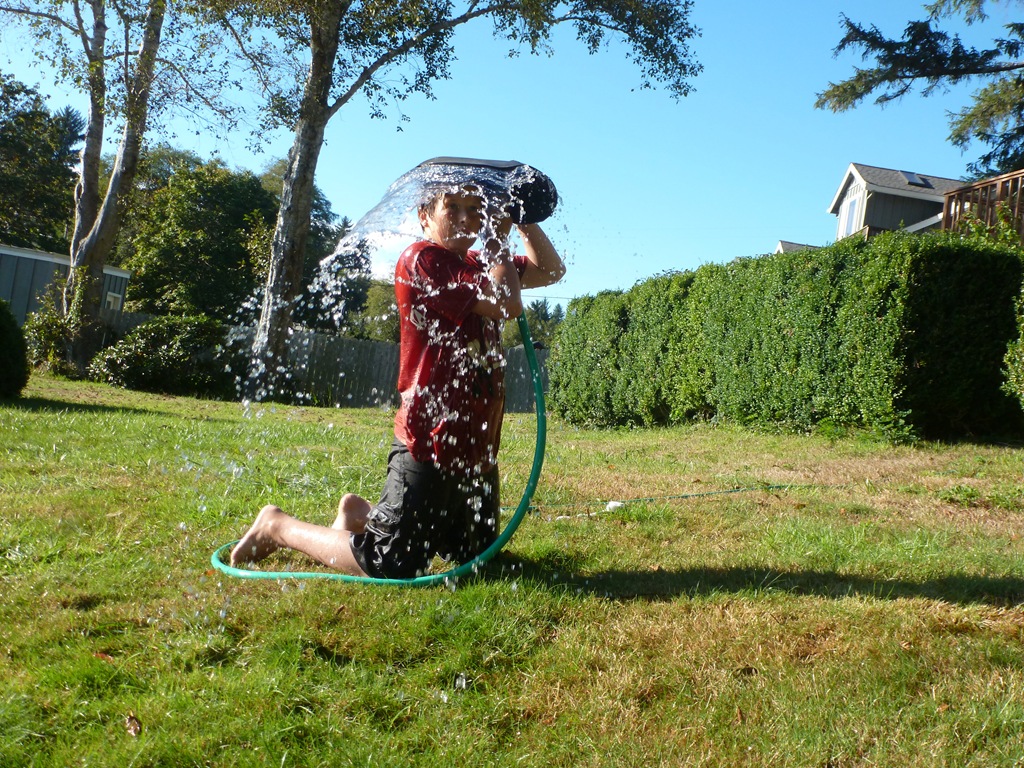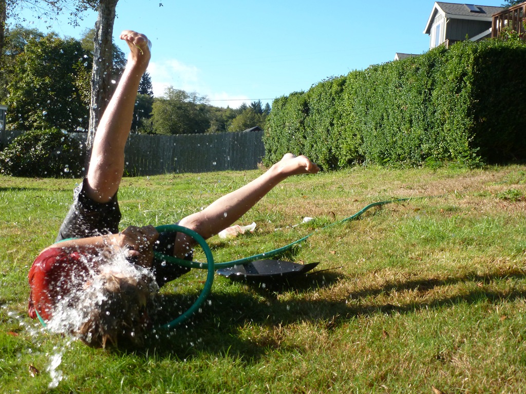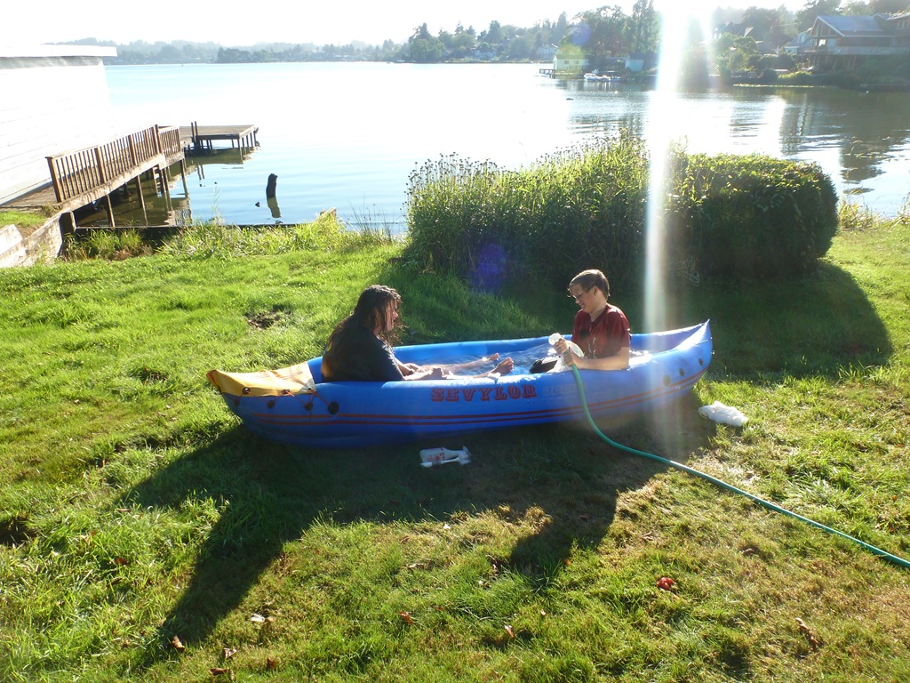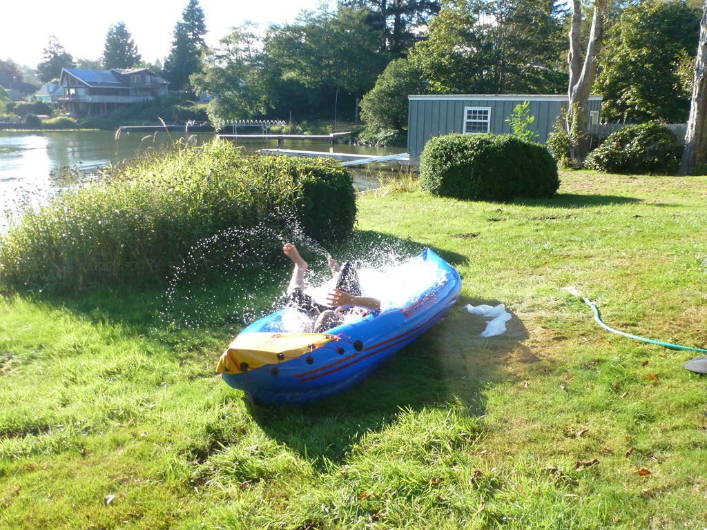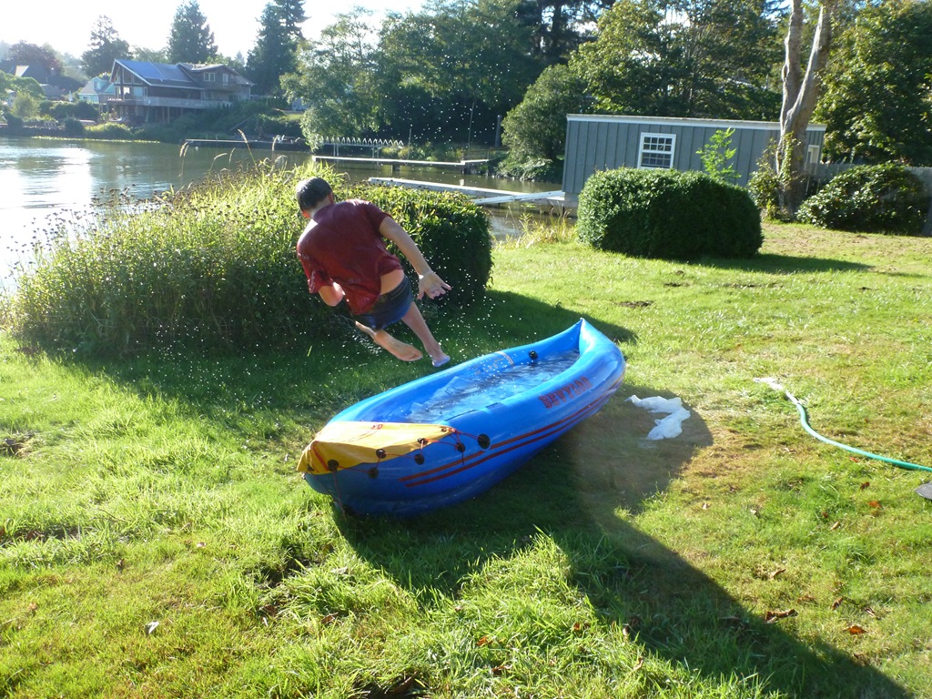 He made a pool out of the inflatable kayak. Then practiced his jumps and rolls.