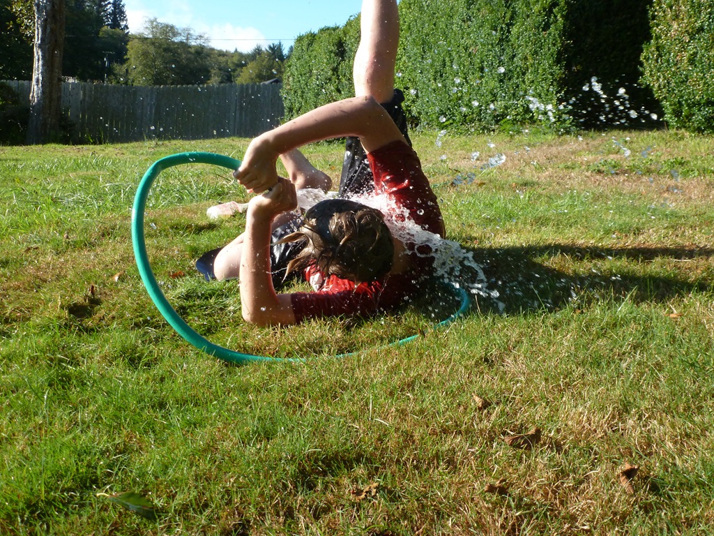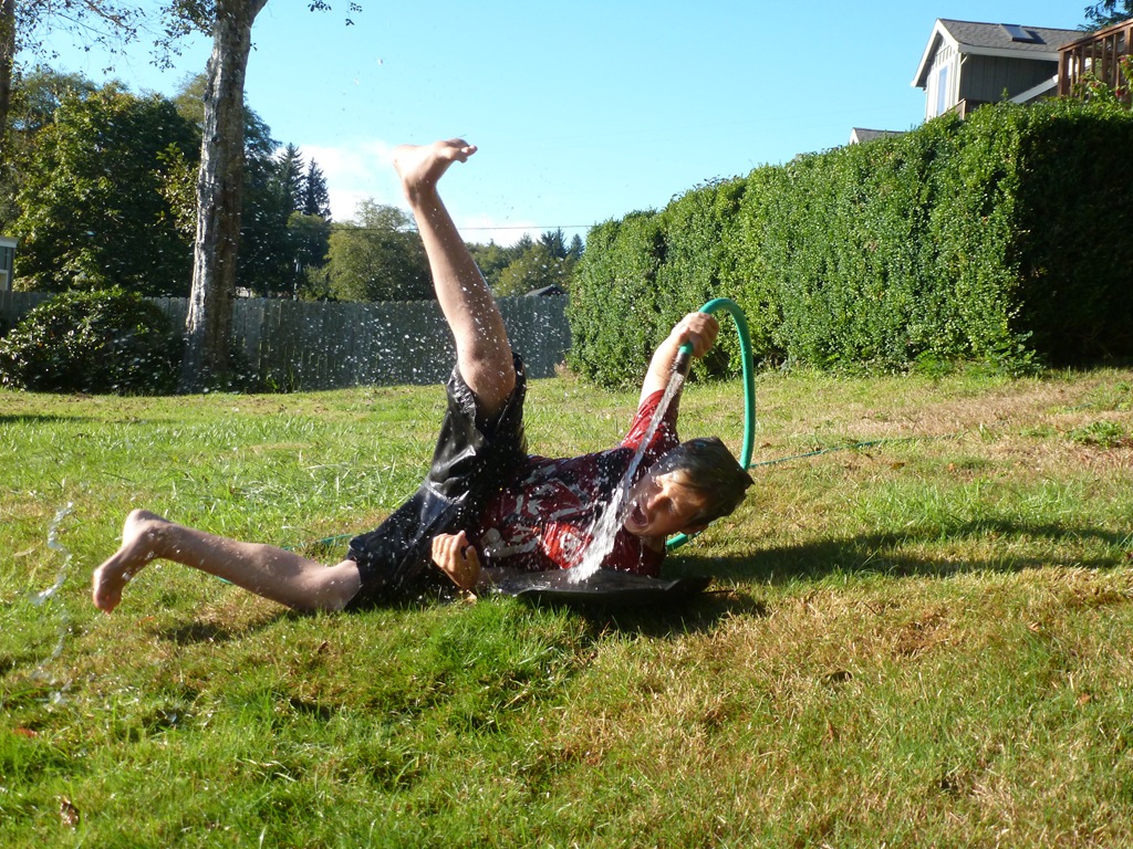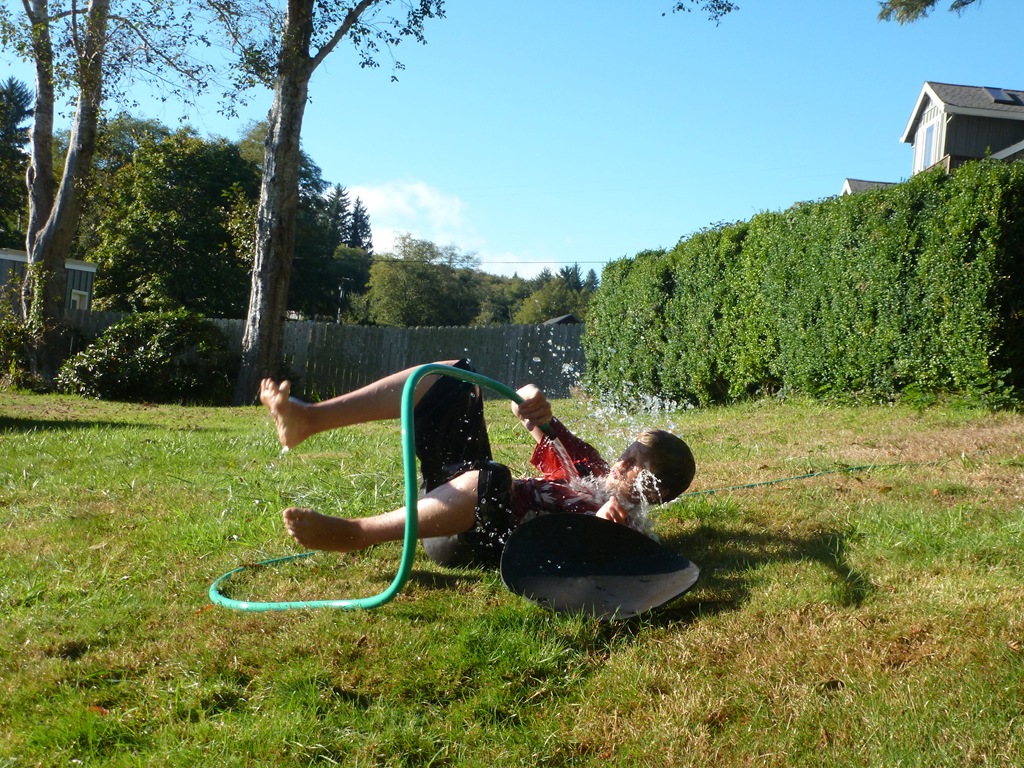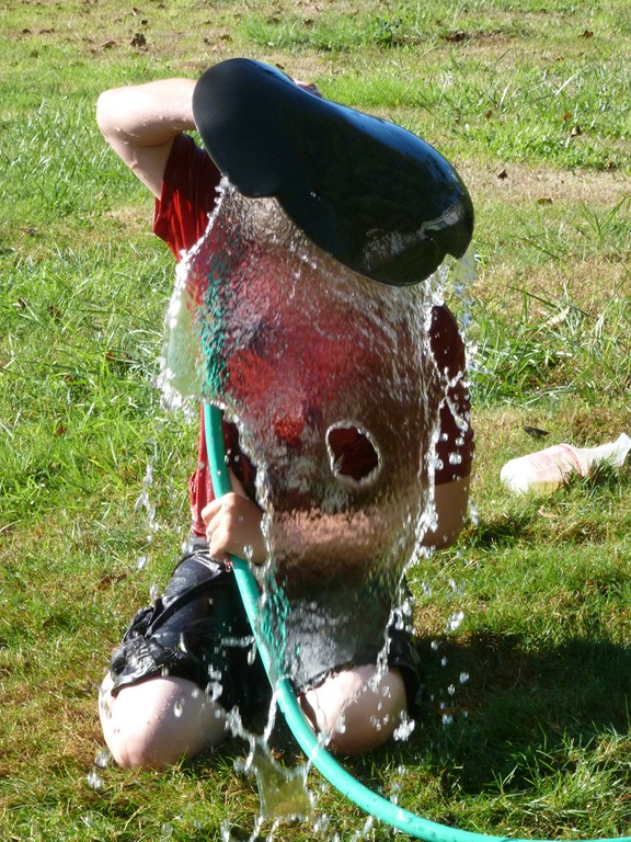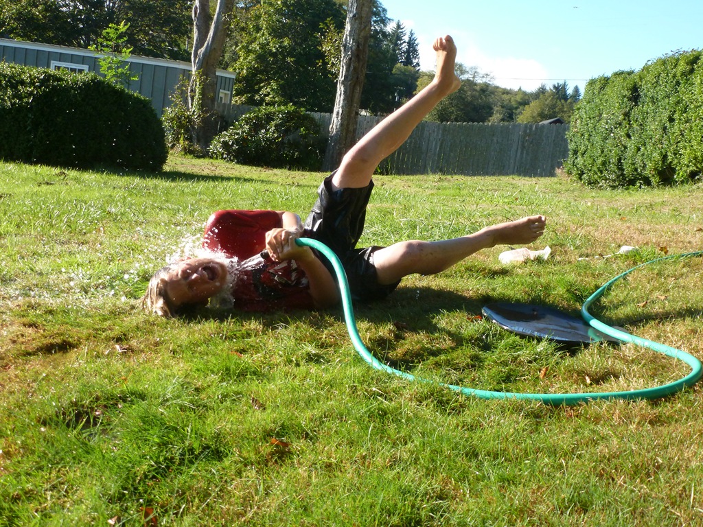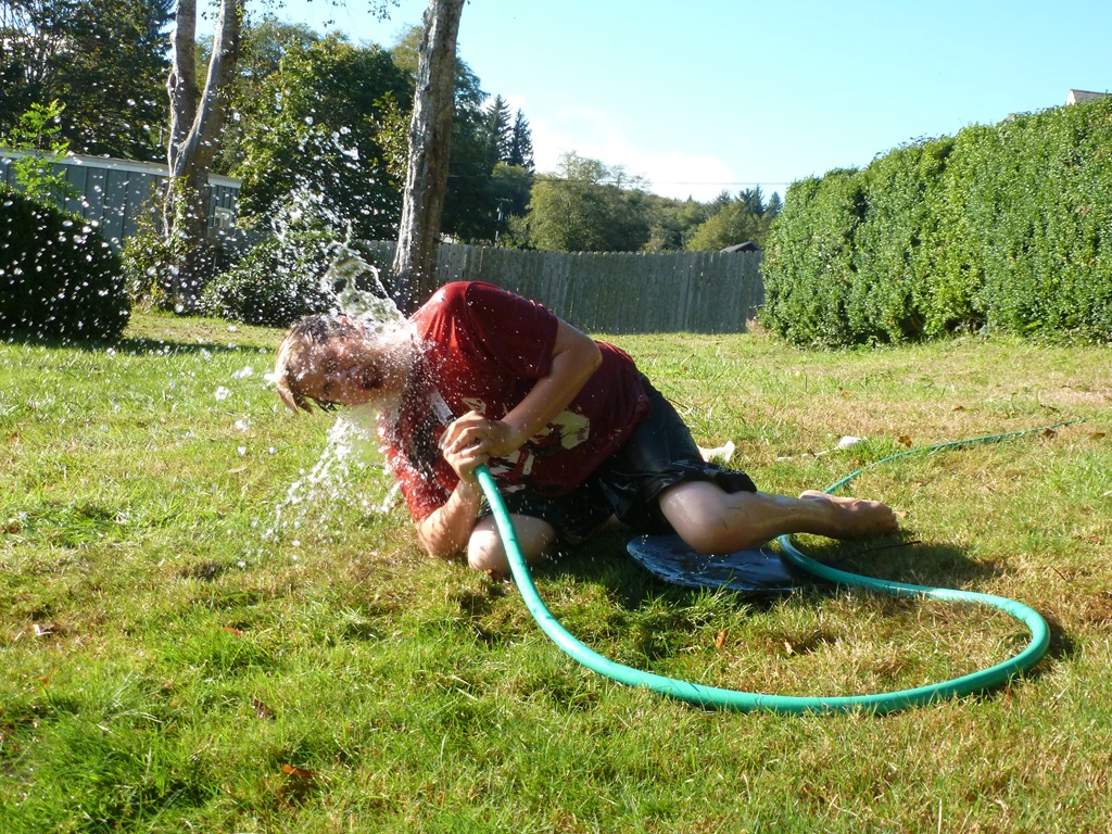 I asked the boys if they wanted to take “First Day of School” photos on Monday and they both grunted. So – Here ya go. We went outside to clean up the yard toys a abit and Jon was playing with the hose. It’s been in the 80’s here – crazy.