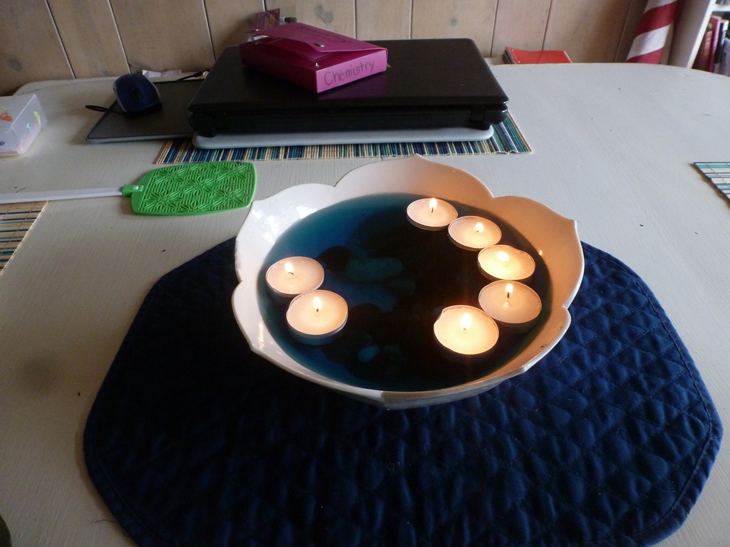 Nate did a Chemistry Lab this week with candles, fire, water and bowls, changing air pressure, and such. Jon grabbed some of the candles, a few agates , and some colored water to decorate our table. (Not an affiliate – we are LOVING Chem 101 DVD!!)