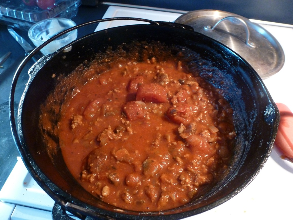 Made a wonderful sauce with tons of veggies and home crafted low fat pork sausage. Mmmmm. Put in quite a large pinch of red peppers. The boys raved about it.