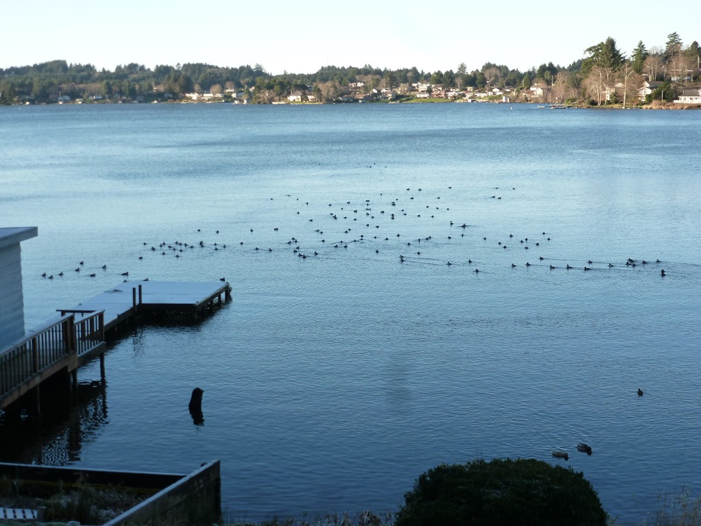 This is before the sun hit our side of the lake. We have a pretty tall hill to the east. Around 9:30 or so the sun peeked out and lit up the white frozen dock. The sun also turned these rafts of little black dots into beautiful multi colored different birds!
