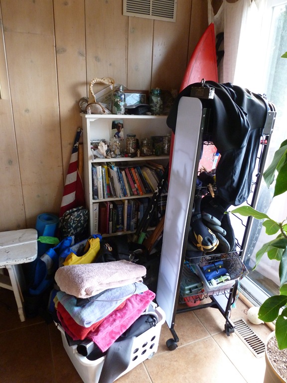 We have various wetsuit pieces that dry on this rack. Many booties, gloves and hoodies. We have 5 wetsuits – 1 each for Jon, Nate and me, then 2 extra for Jon’s friends. We have SUP paddles, life jackets and extra boards here too. Oh, and behind all of that is the discovery shelf and field guides. I need to relocate the red board so I can easily get to the field guides again.