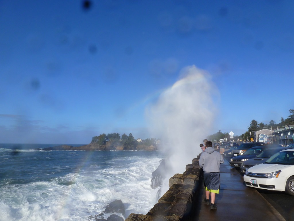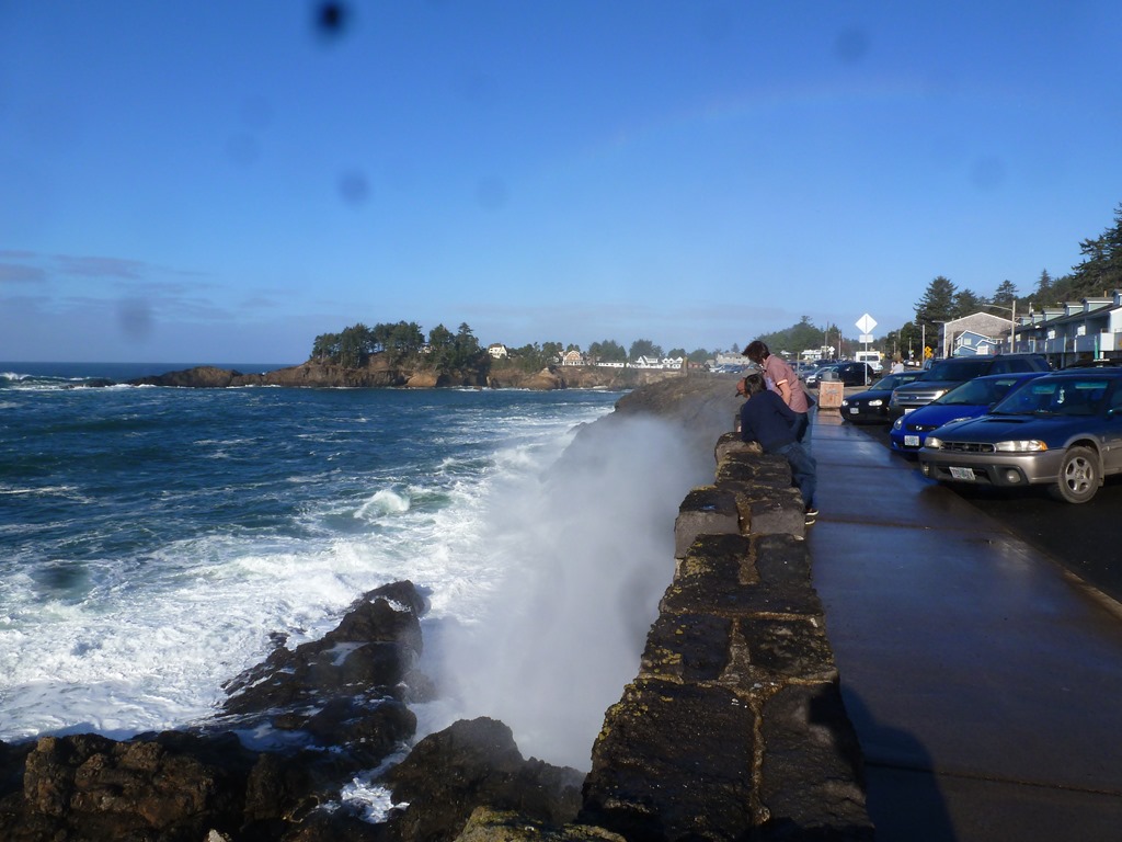 There are a few spouts. This is right along Hwy 101. Our favorite is a bit to the south where there is a long natural tube of rock. The swell will travel up through this tube then shoot like an arc over the street and send spray for several yards.
