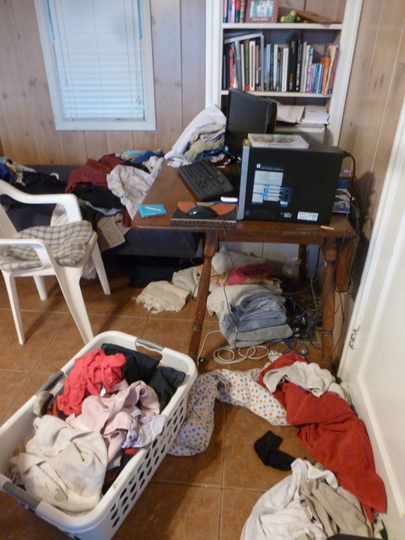 I was sad, because this area was clean yesterday, but then looking around, I see that someone brought up laundry from downstairs, ran one load of laundry, hence the clean laundry on the futon, and that the towel pile isn’t knocked over yet. At least I’m not the only one doing laundry. I like to sit here and watch an episode on Netflix and fold. Now I’ll have time to see how my underwater gold dredgers are doing today.
