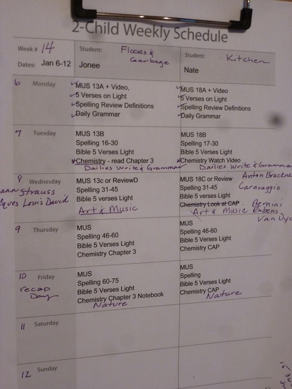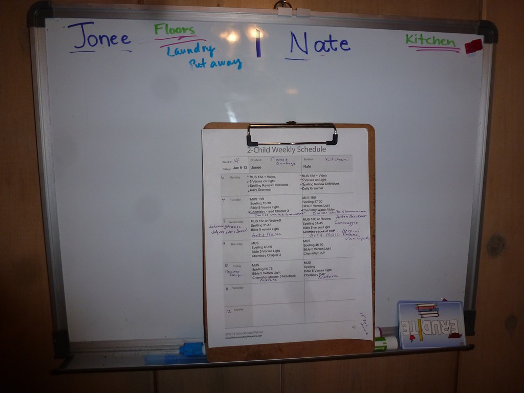I’ve moved to more of a printed weekly schedule than just the schedule on the board. The boys seem to do better if I write it on the white board, so not sure if I’ll sue the printed for me, and write out their lists on the board still.