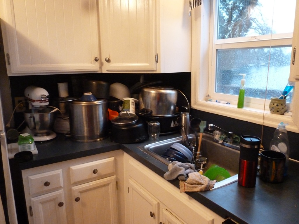 Nate did the dishes last night, but they didn’t get put away. Making whole foods from scratch sure piles up the pots and pans!