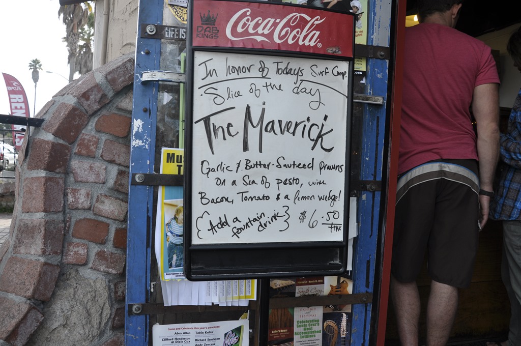 We ordered The Maverick, in honor of the day, and of the Chasing Mavericks movie that Jon is such a fan of. We got to talk to the staff. They are so kind and excited for crazed fan tourists like us. They sent us over to their East Side Eatery to meet the owner. He chatted it up with Jon quite a bit and Jonee was surprisingly speechless. He can go on and on about Jay and Frosty and Pleasure Pizza, but standing in front of someone connected – he went silent. Kind of funny.