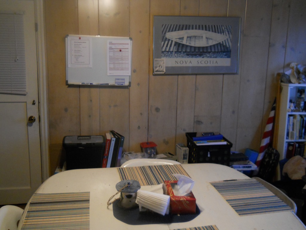 We have the dining room cleared out from any signs of lots of company and holidays. Workboxes set back to rights. We enjoy the table smaller, easier to speak. You just have to look out for the foot wars with the boys.