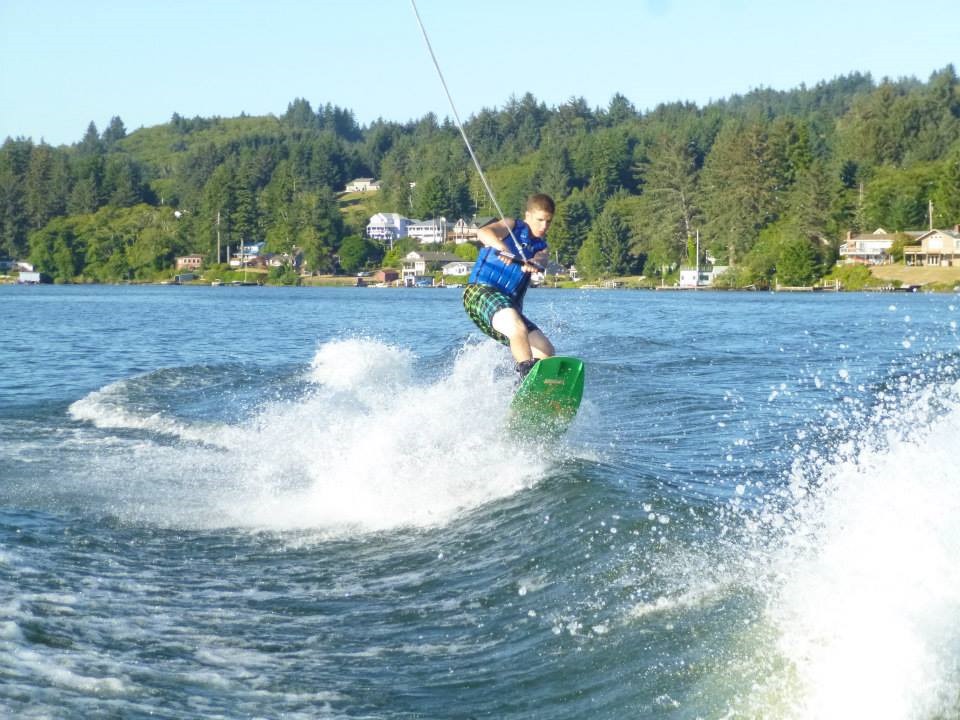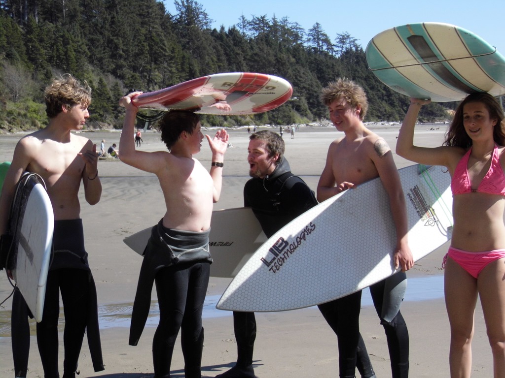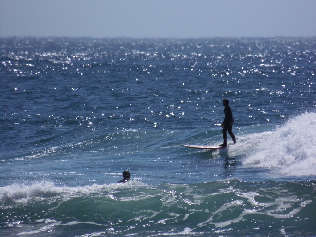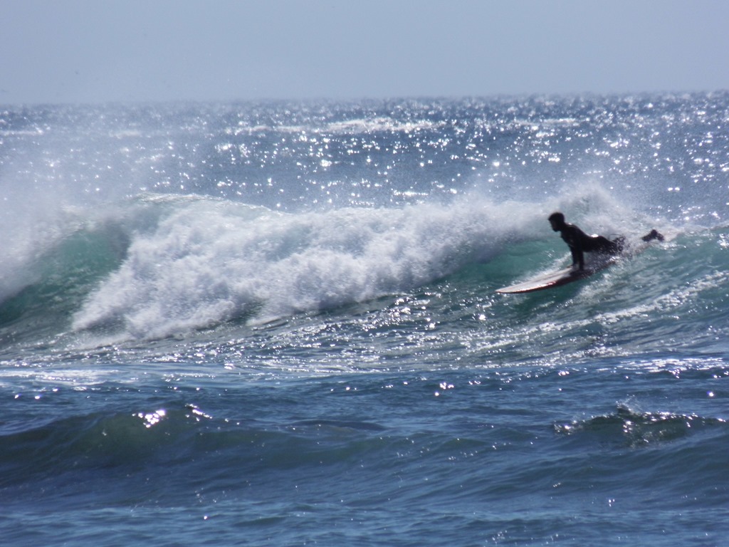 Surf’s Up! Not glassy –but he’ll take what he can get in between the spring storms.