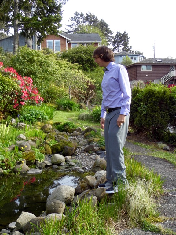 Well. I think we’ve proven that we need to be more concerned with carving out time for academics than worrying about his activities with kids and adults. He’s mastered Algebra 1 and Geometry and is going to love Algebra 2. Who loves algebra? Blech. And now – I give you – Prom photos. The photo above is for my friends Barb, Tricia and Eva. Even dressed up, he wanders over to one of our ‘year long’ study spots to check on his fish, frogs and pond plants.