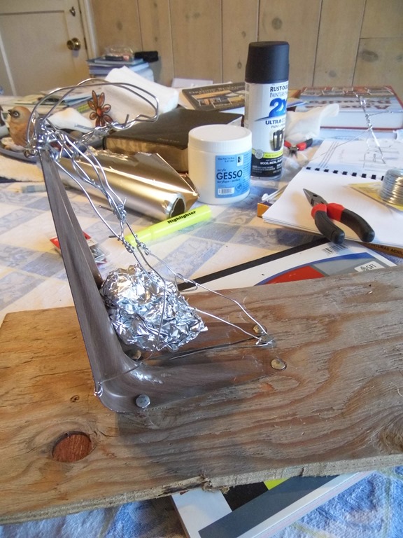 He got to work creating a base. The project idea is a flying monkey on a stack of corn, and he saw Surfer jumping off of a Wave. This project appealed to him because of the initial construction. I purchased screws, nuts, washers and bolts, but he went with nails first.