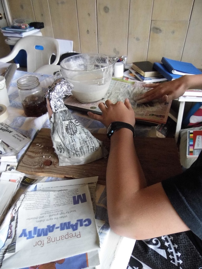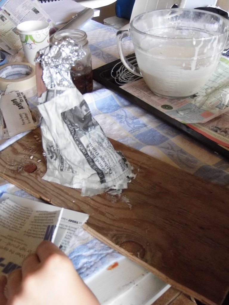 The next step was to cover with strips of paper and make the glue out of flour and water. We looked through earlier projects to get the recipe and instructions.