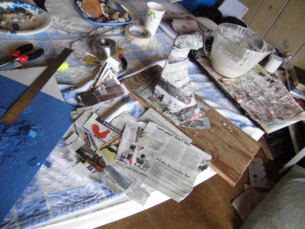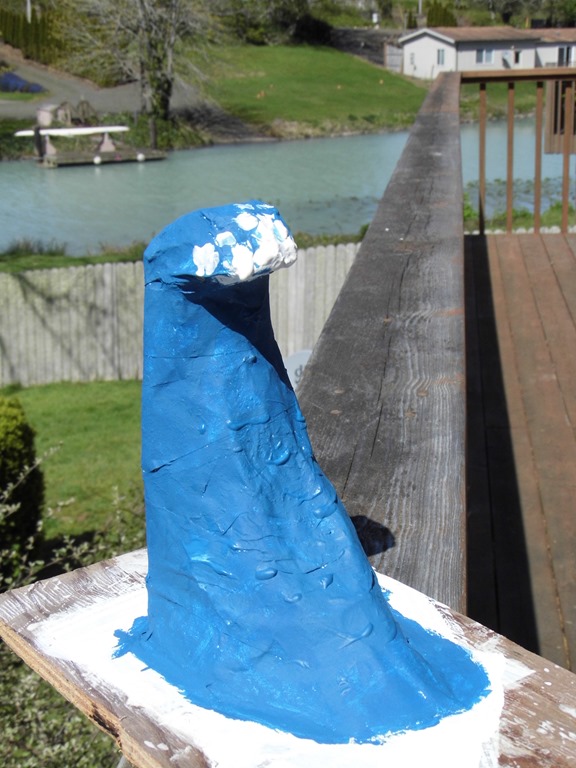 His finished product . . . no surfer. So, he forgot the balance part. But he did get the papier-mache and 3d molding down.