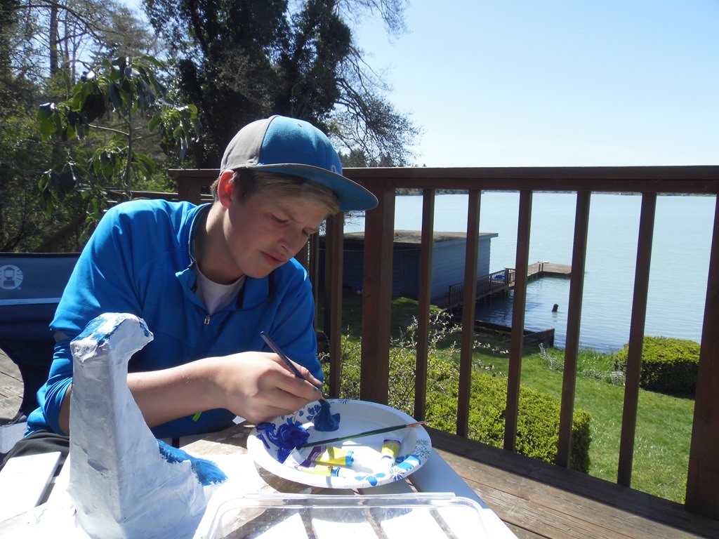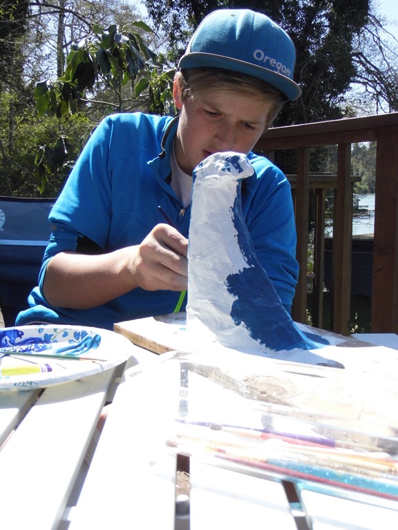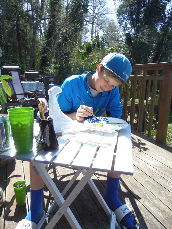 After a couple of days – it was really hard and ready to paint. He set himself up outside on a sunny day. There are detailed painting instructions to guide the student as well, including how much paint to use with your brushes and how to clean up.