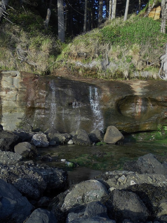 The rock formations are incredible. The differences on the Oregon Coast are amazing. They create more questions of how and why than answers. This is a basalt cliff. In the middle is a large section of Conglomerate rock, pillow basalt and sand stone. The combinations are breathtaking. What is missing in this section of Boiler Bay? Fossils. I looked and looked at the layers and did not find any indication of fossils.
