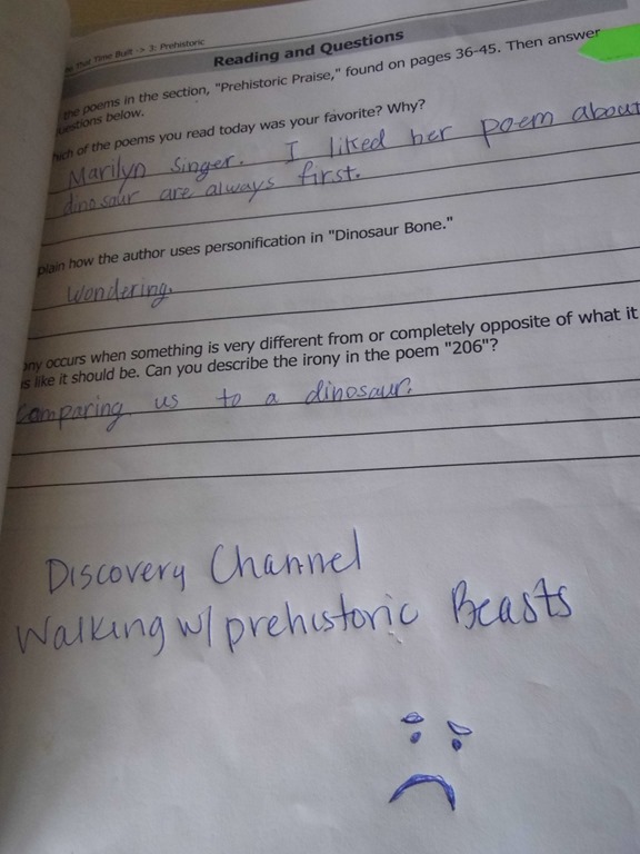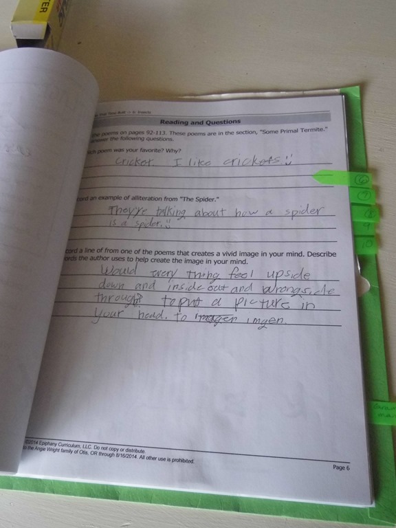 So we start with Reading and Questions. A simple one page start to the lesson. This gives the page numbers to read and a few think about it questions. I would put which lesson we were on on our White Board each morning, and we’d work on that lesson until it was finished. I was a bit surprised at how much Jon enjoyed the poetry and the questions. Based on the recommendations that your child be able to “Able to write multiple paragraphs on a topic and be familiar with the five paragraph essay” I’m not sure we pushed this into Writing as much as we should. We did most of the questions verbally, around the table or in the car or at the beach. He knew he’d have to verbally answer which poem he enjoyed most or least and what he learned from one of the questions at a random hour of the day, and was eager to share.
