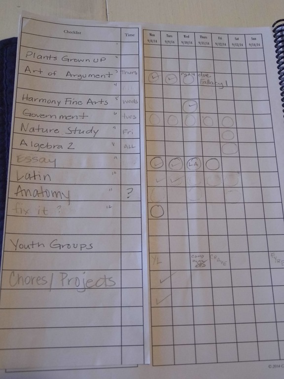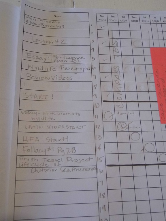 As our school week started, we used a new page for the checklist. I wrote out the subjects and activities, and then used the Notes to communicate how much work, which lessons, what pages, what chores needed to be done. I used the squares to show what days I expected them to be completed by. Some things are once a week, others daily. This seriously helped communication between my busy son and I.
