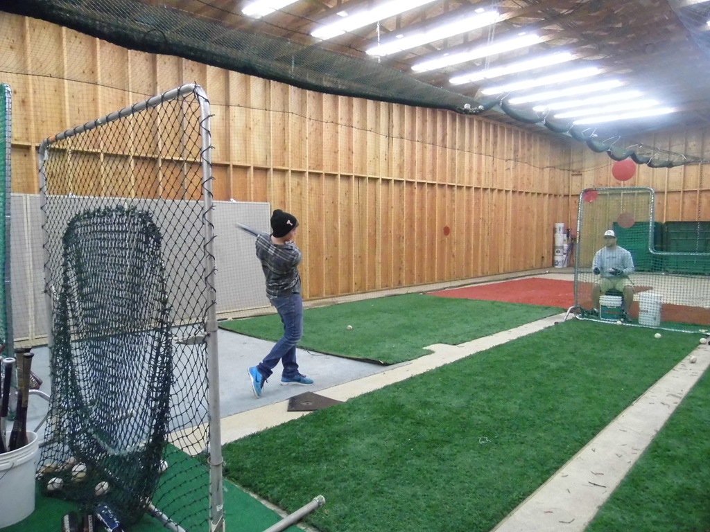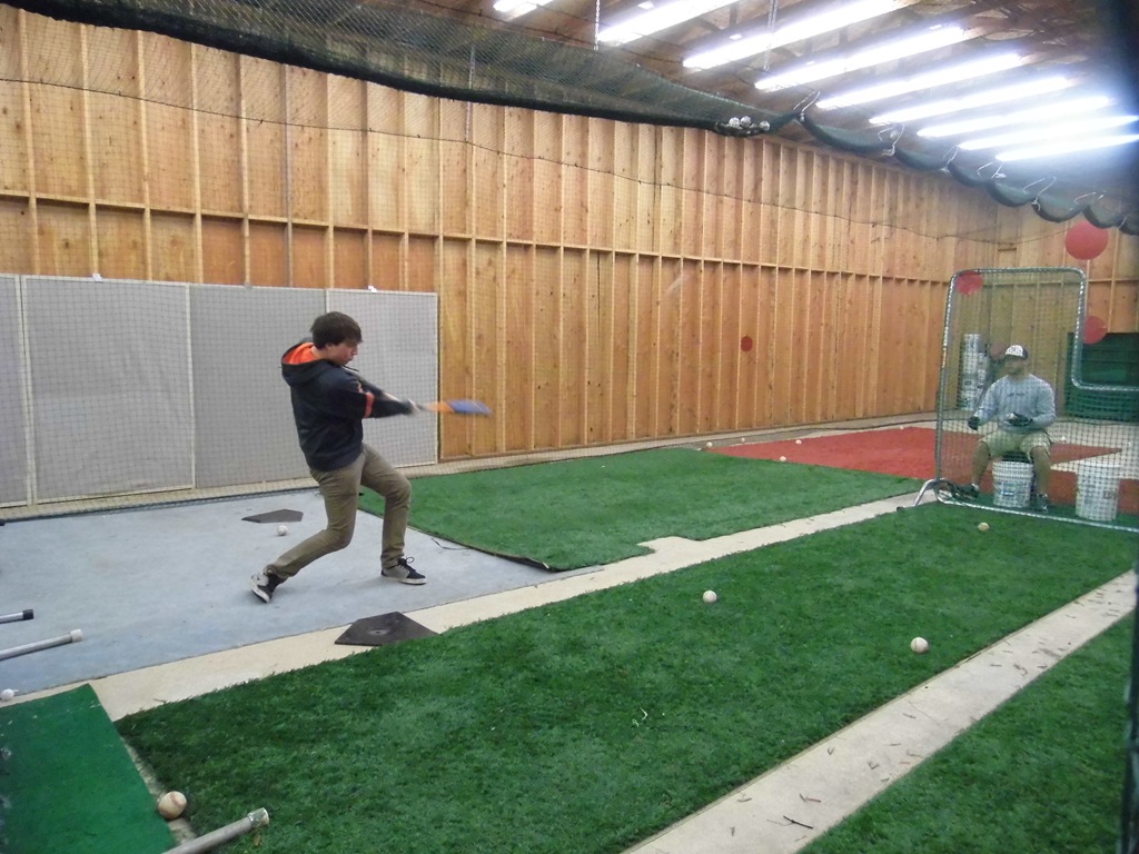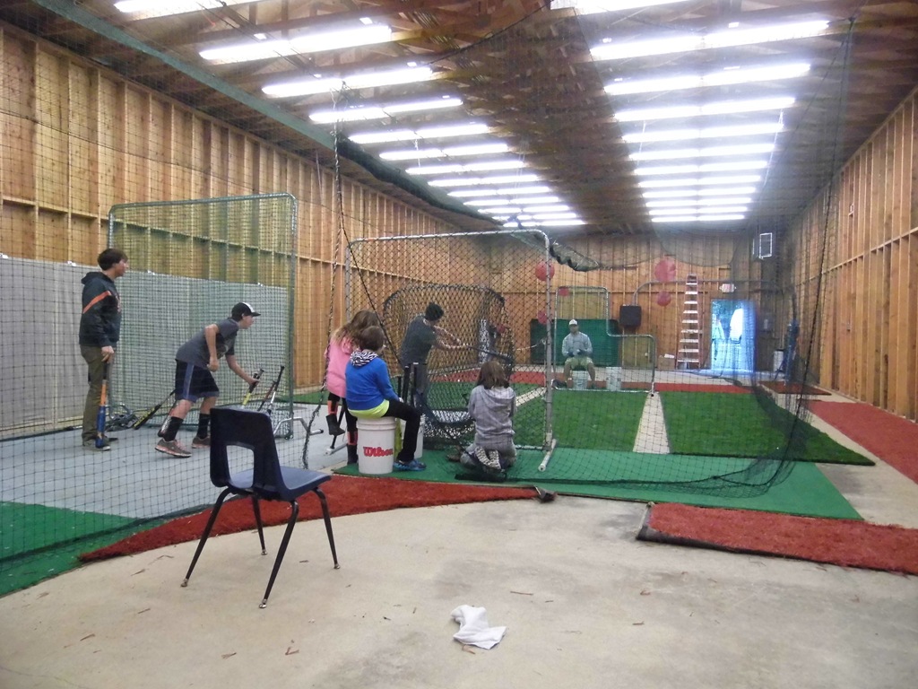 Speaking of fun – have you ever heard of a Hitting League? Lincoln City Taft Tigers put on a Hitting League this late fall. We met on Sundays, several 3 person teams. See the red dots on the net? Each one gives points or outs. Hit the net on top – out. Hit below the line in the pitcher’s box, out. Under hand soft pitches – the goal is to get line drives.