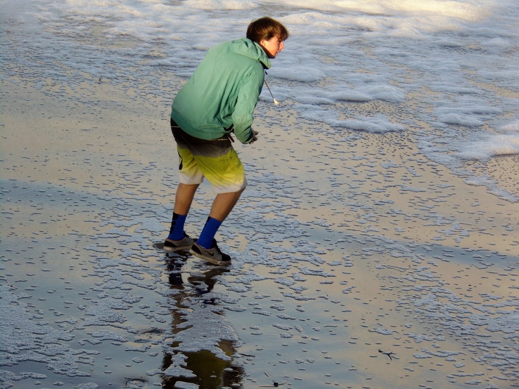 This picture doesn’t actually show it, but our town has a program called Finder’s Keepers. Here’s a post from Jon’s first float. We were out looking to mark the high tide King Tide and Nate saw a float rolling around in the surf. All I knew was this crazy kid jumped off the sea wall and started running for it. He made it back before the swell came back to the wall. BTW, Love his outfit . . . colorful kid. He had just gotten off work at the pool.