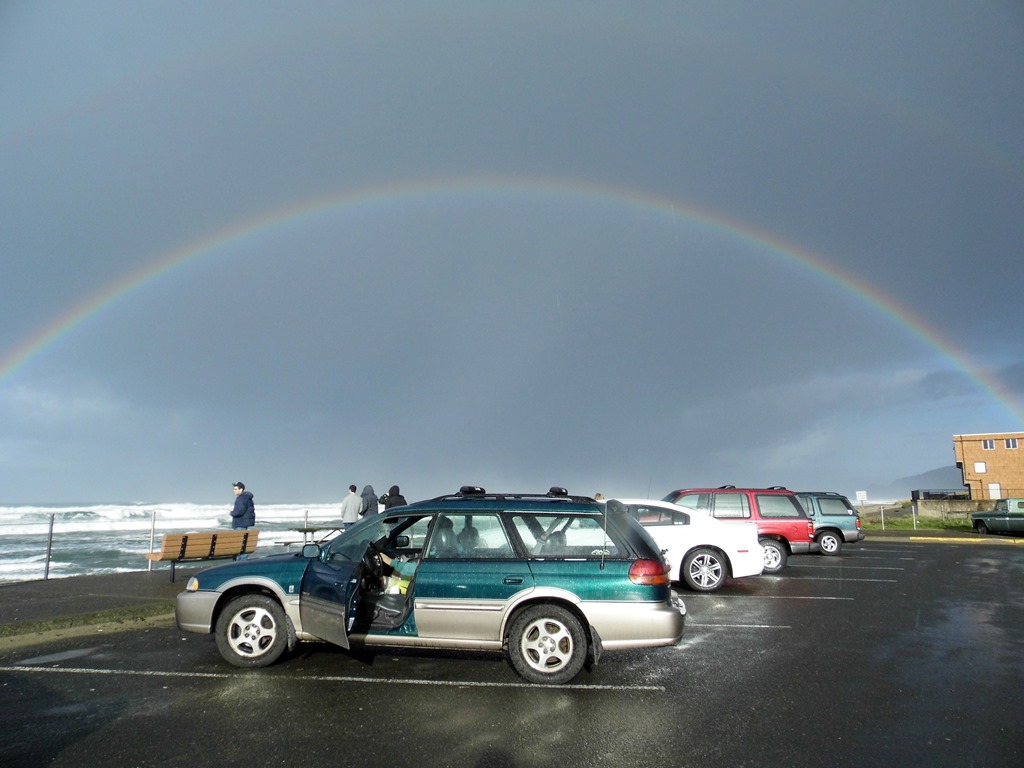 While driving out – we spotted a rainbow at the river mouth. Had to pull into the D River State Park and take some photos. Below is our lil adventure car under the rainbow.