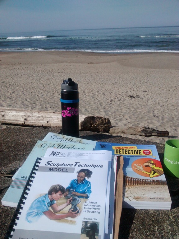 We’ve been working on Greek, Art, Math and History. Greek Roots, Model Sculpting, Learning about Islam and in Pre-Algebra learning Ratios this week. Teacher Planning at the beach.