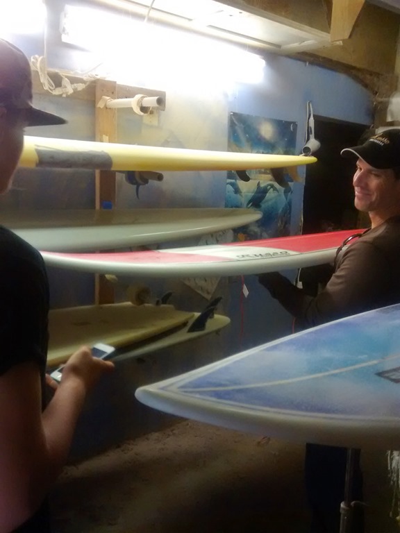 Jon’s new short board is almost fun. Talking to our local shaper, Rob from Russo Surfboards about how the process is working out. We always enjoy hanging out in his shaping room!