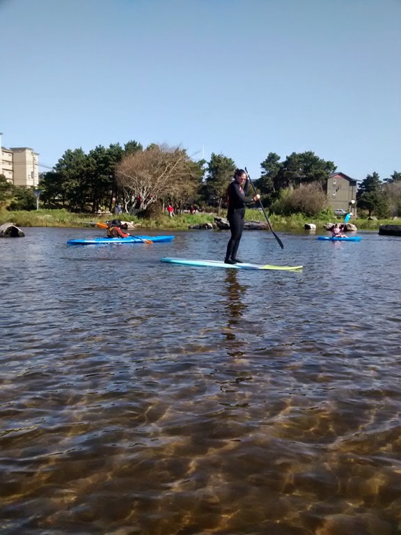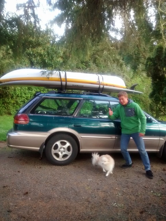 This weekend we were able to participate in a community event – Lincoln City Community Days – 50th Birthday Celebration – Regatta Park Paddle. I don’t think we made t’shirts because the title didn’t fit. Ha. Folks were urged to grab anything that could paddle and extra kayaks were available as well. My friend and Max helped me flip my SUP board and Kayak on the Subaru.