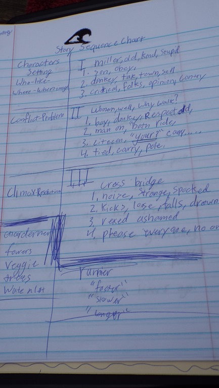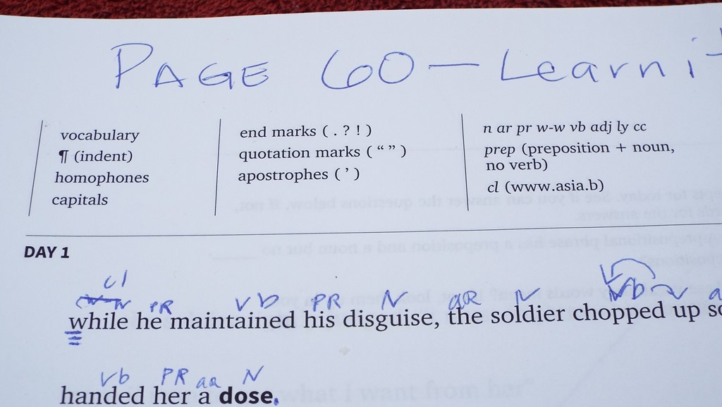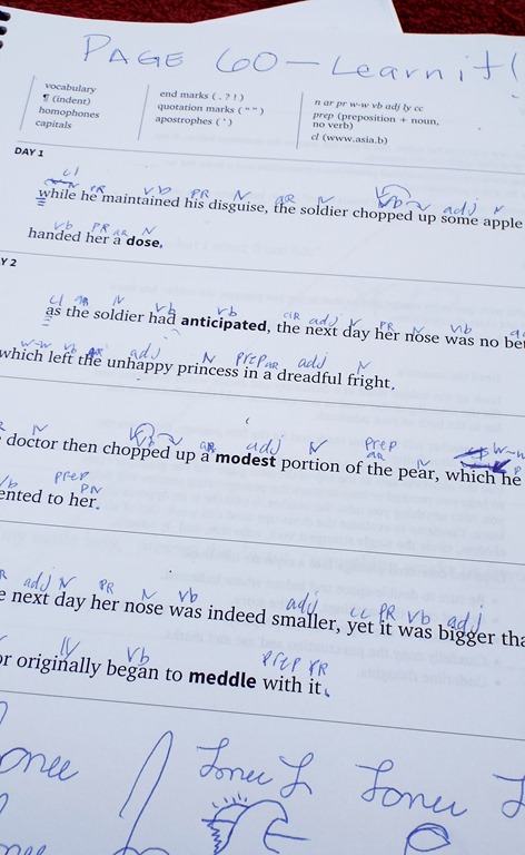 The simple summary – we work day by day, one sentence a day – observing a well written text, looking for grammar bits and pieces, marking as directed. We learn a new piece each week. At the end of the 15 minute class time, the student re-writes the sentence, building the story in a notebook.