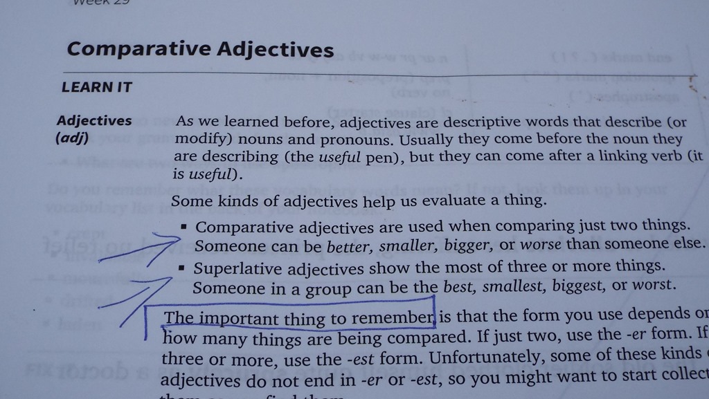 Look at the top right corner of the page – Comparative Adjectives and LEARN IT. It took me a few weeks to realize that the topic was up there. I look through the work first to see what needs brushed up. We go through the first day together with me helping. Now that we are on the final days, I sit back and see how much he can do without assistance, but I am always encouraged in the teacher’s text to help. ![]()