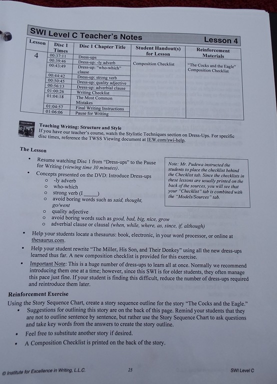 The writing and reading portion of SWI C is right at where my son, age 14, 8th grade is right now. It is sort of like the math teacher that teaches a new way to solve a problem but only gives them 2, 4, and 5 as numbers to add and multiply. Simple math – focus on the technique. Same with SWI – Challenging yet simple enough text, focus on the techniques.