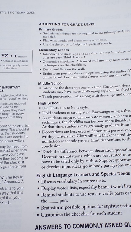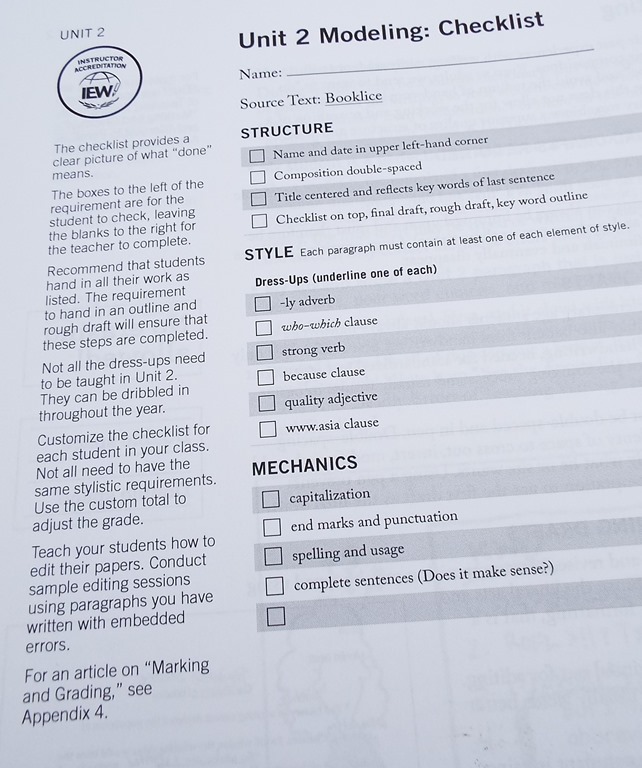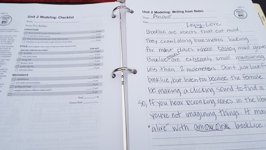 After the Styles were introduced, we were directed back to Unit 2 – Modeling: Writing from Notes. As shown above, a very small checklist was given, even indicating points for what is given from the student. There student examples for several age groups. And then there is a practicum for the teacher to try our hand at it.