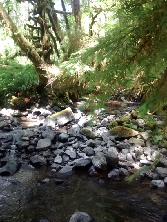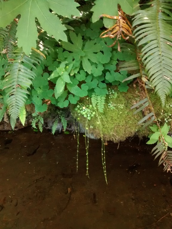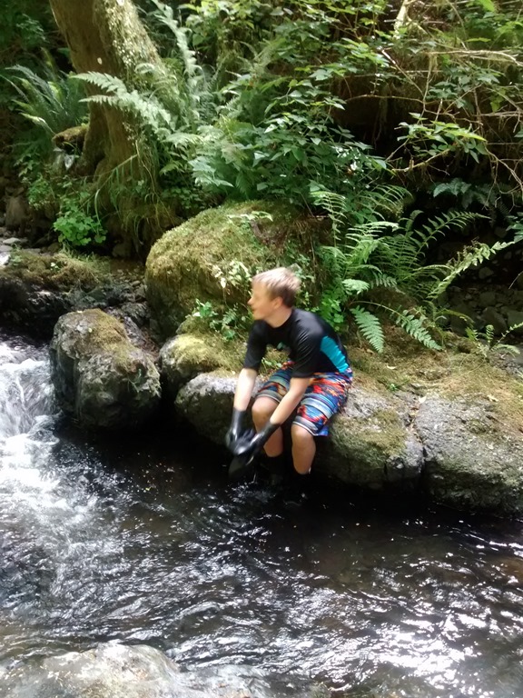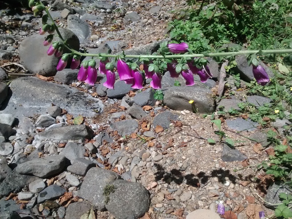 Oyster Mushrooms were abundant on the trail the first day. Usually on dead red alder trees, fresh after a rain on the first day of direct sunlight, they will come back all summer long. Tasty. If you have a guide – to make sure you have the right ones, be sure to soak them for a few minutes in water to get all the tiny bugs out – they are a buggy/white wormy – specimen. Speaking of eating, they learned that the Foxglove is used by the medical field to speed up heart rates.